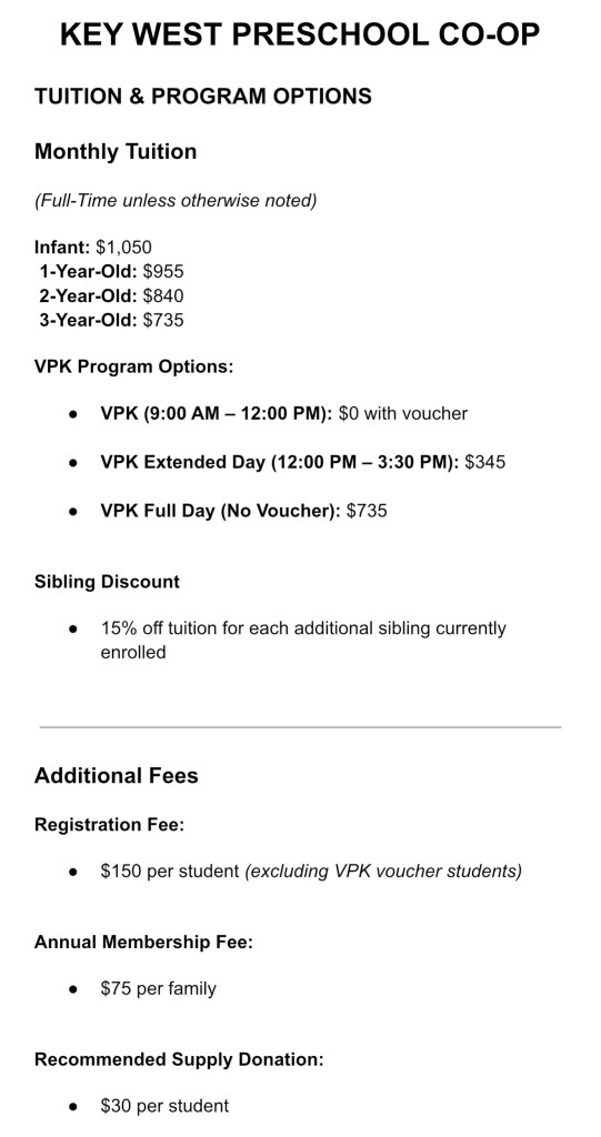 Key West Preschool welcomes all Lower Keys students and their families ages 6 weeks to 5 years old (VPK) for full-time or part-time programs. The nature of our program is one of inclusivity, where parents/guardians play an active role in their child’s development by working alongside our teachers as volunteers. We believe the best learning for our young ones includes parental/guardian participation to ease their transition. Please see our Member Handbook for more information.